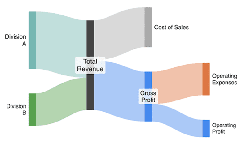 Sankey diyagramları özellikle gelir–gider analizinde güçlü bir araçtır. Şirketlerin gelir kaynaklarını, bu gelirlerin hangi operasyonel kanallara aktığını ve nihayetinde hangi gider kalemlerinde yoğunlaştığını oransal olarak gösterebilir. Örneğin bir işletmenin ürün satışlarından elde ettiği gelirin ne kadarının hammadde maliyetine, çalışan giderlerine, yatırımlara veya borç ödemelerine yöneldiği açık biçimde görüntülenebilir. Bu yaklaşım, nakit akış tablosunun görsel bir versiyonu olarak düşünülebilir ve finansal sağlığın okunmasını kolaylaştırır.