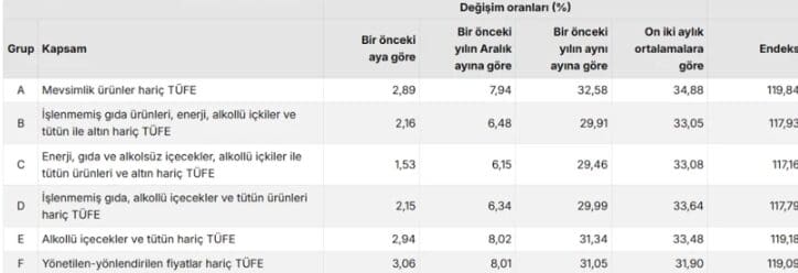 Enerji, işlenmemiş gıda, alkollü içecekler, tütün ve altın gibi oynak kalemlerin hariç tutulduğu çekirdek enflasyon göstergesi de şubat ayında artış kaydetti. TÜİK verilerine göre özel kapsamlı TÜFE göstergesi (B) aylık bazda yüzde 2,16, yıllık bazda ise yüzde 29,91 olarak hesaplandı.
