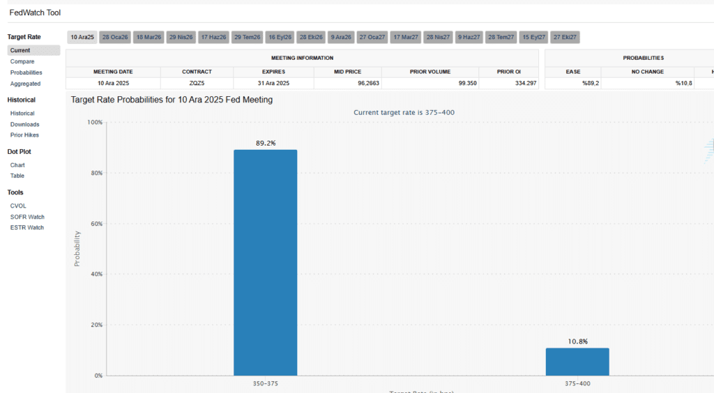Ancak FedWatch’a göre 25 baz puanlık faiz indirimi ihtimali %89,2 olarak fiyatlanıyor.