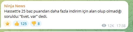 Öte yandan Fed başkanlığı için adı öne çıkan Beyaz Saray ekonomi danışmanı Kevin Hassett, faiz indirimlerinin devamı için “bolca alan” bulunduğunu ifade ederken, enflasyondaki olası bir artışın bu görünümü değiştirebileceğine vurgu yaptı.