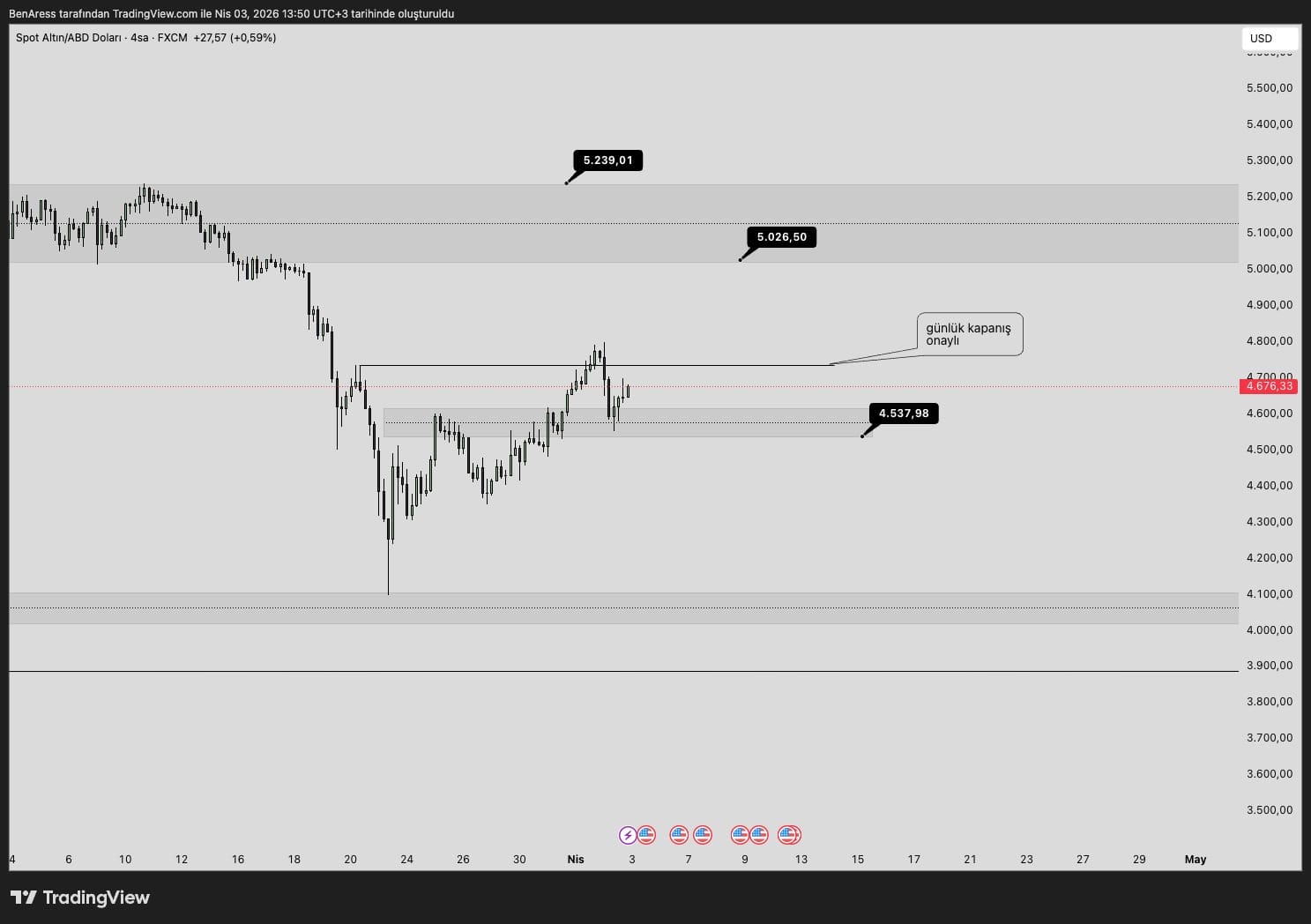 Teknik görünümde, 4.735 dolar seviyesi önemli bir direnç olarak öne çıkıyor. Bu seviyenin günlük kapanışla aşılması halinde, yukarı yönlü hareketin 5.026 – 5.239 dolar bandına kadar devam etmesi beklenebilir. Ancak 4.537 dolar seviyesinin aşağı yönlü kırılması durumunda, bu yükseliş senaryosu geçerliliğini yitirebilir.