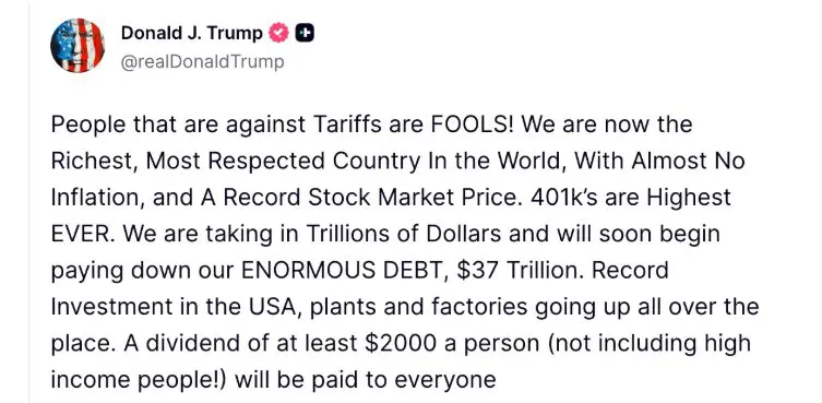 Trump, “Bu tarifelerle ABD trilyonlarca dolar kazandı. Bu gelirler, 37 trilyon dolarlık ulusal borcun azaltılmasına katkı sağlayabilir.” ifadelerini kullandı.