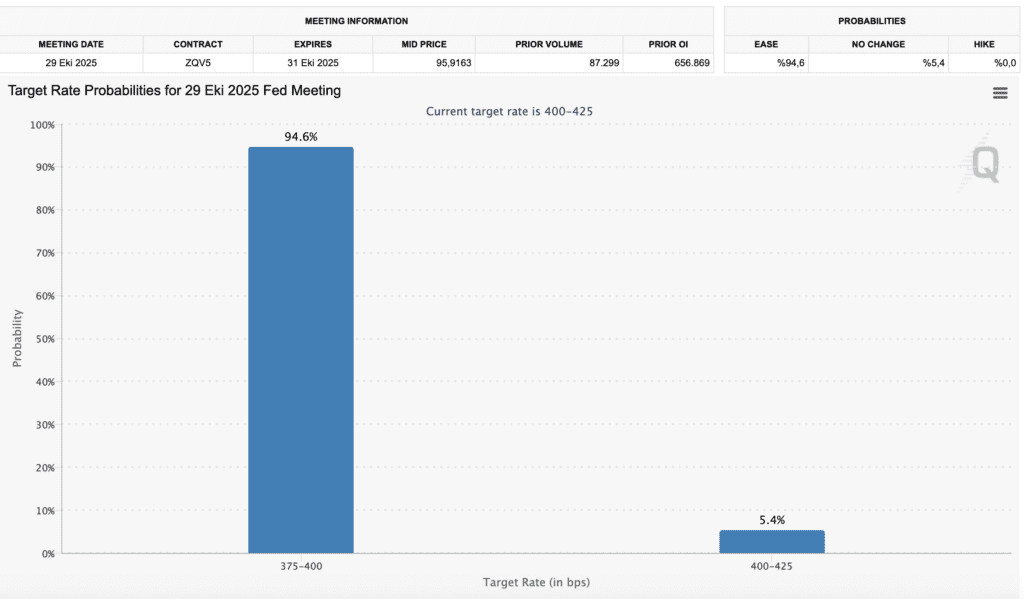 Analistlere göre, kripto piyasası şu anda güçlü dolar, dalgalı tahvil getirileri ve ABD’deki kısmi hükümet kapanması sebebiyle belirsizlik içinde. Öte yandan CME’nin FedWatch Aracı, ay sonunda FED faiz indirimi olasılığını %94,6 olarak gösteriyor.