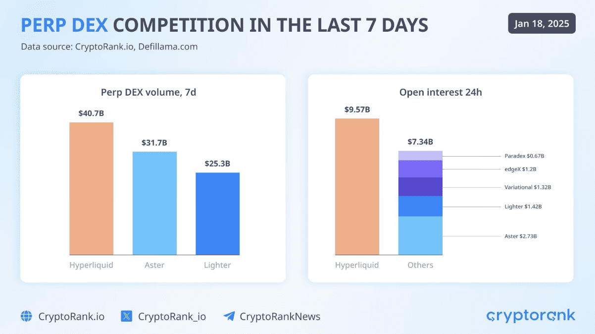 Hyperliquid, son yedi günde yaklaşık 40,7 milyar dolarlık sürekli vadeli işlem hacmi üretti. Aynı dönemde Aster 31,7 milyar dolar, Lighter ise 25,3 milyar dolar seviyesinde kaldı. Veriler, Hyperliquid’in haftalık hacimde rakiplerini açık farkla geride bıraktığını gösteriyor.