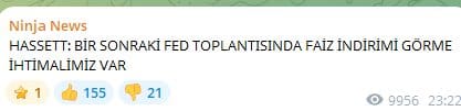 Ayrıca Hasset’ın açıklamaları da faiz indirimi ihtimallerine katkı sağladı.