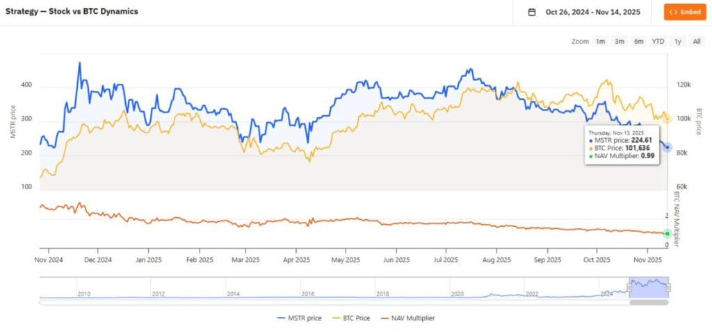 Dünyanın en büyük kurumsal Bitcoin sahibi Strategy, kripto piyasasındaki genel düşüşün de etkisiyle belirgin bir değer kaybı yaşıyor. Şirketin net varlık değeri çarpanı (mNAV) ilk kez 1’in altına geriledi; piyasanın yıllardır primle işlem gören MSTR hisseleri iskontolu fiyatlamaya başladı.