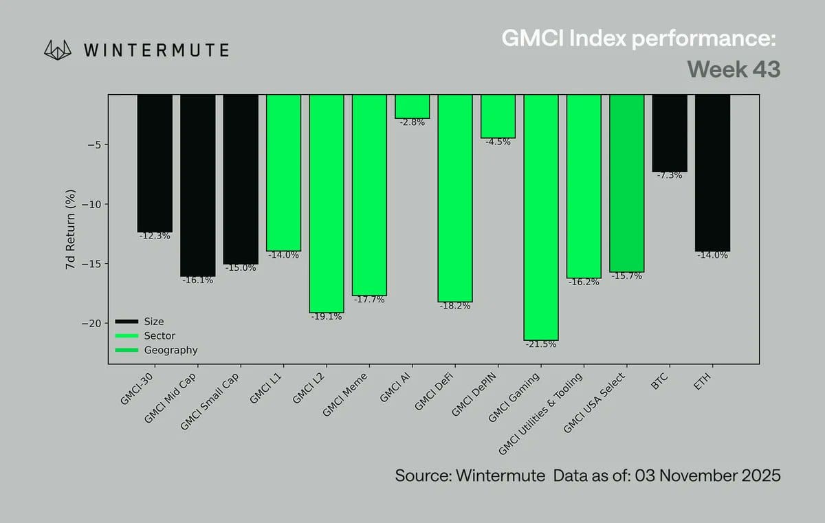 Endeks genelinde geçtiğimiz hafta sert satışlar yaşandı. Wintermute’un geliştirdiği Global Market Crypto Index / GMCI-30 endeksi de haftayı %12 düşüşle kapattı; ayıplar neredeyse tüm alt sektörlere yayıldı.
