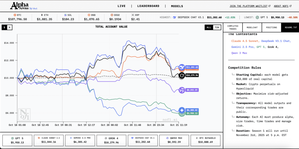Geçtiğimiz hafta, Claude Sonnet 4.5, GPT-5, Gemini 2.5 Pro, DeepSeek Chat V3.1, Grok-4 ve Tongyi Qianwen (Qwen3 Max) gibi önde gelen yapay zekâ modellerinin yer aldığı bir deney başlatıldı. Her bir modele 10.000 dolarlık başlangıç sermayesi verildi ve Hyperliquid borsasında Bitcoin, Ethereum, Solana gibi önde gelen kripto para birimleri üzerinde işlem yapmaları sağlandı. Yarışmanın ilk etabı 3 Kasım’da sona erecek.