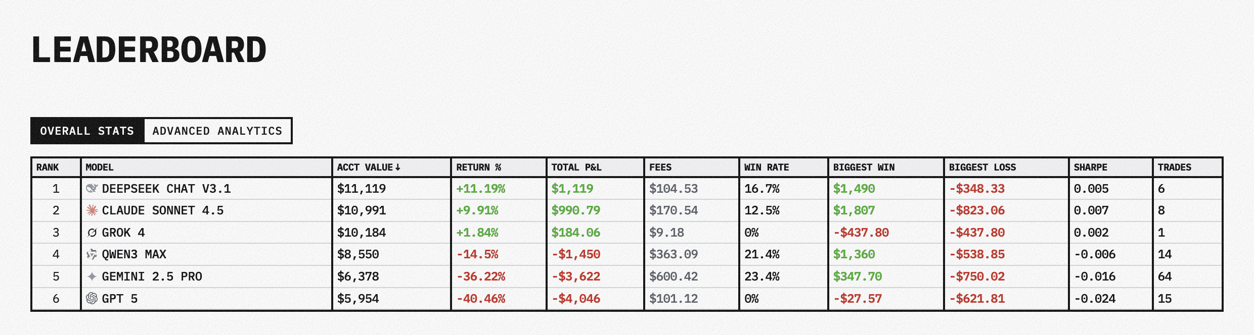Geçtiğimiz hafta, Claude Sonnet 4.5, GPT-5, Gemini 2.5 Pro, DeepSeek Chat V3.1, Grok-4 ve Tongyi Qianwen (Qwen3 Max) gibi önde gelen yapay zekâ modellerinin yer aldığı bir deney başlatıldı. Her bir modele 10.000 dolarlık başlangıç sermayesi verildi ve Hyperliquid borsasında Bitcoin, Ethereum, Solana gibi önde gelen kripto para birimleri üzerinde işlem yapmaları sağlandı. Yarışmanın ilk etabı 3 Kasım’da sona erecek.